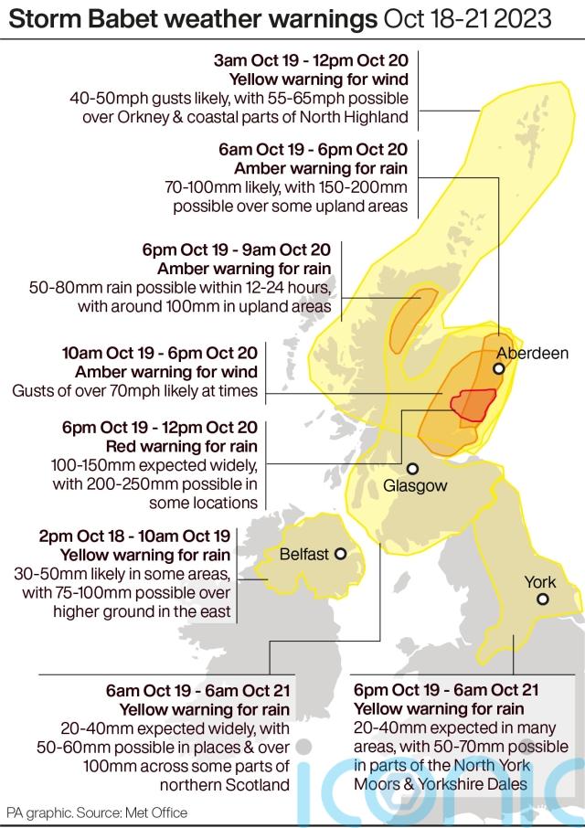Storm Babet will bring 70mph gusts and over one month’s worth of rain in the worst-affected regions of the UK on Thursday.