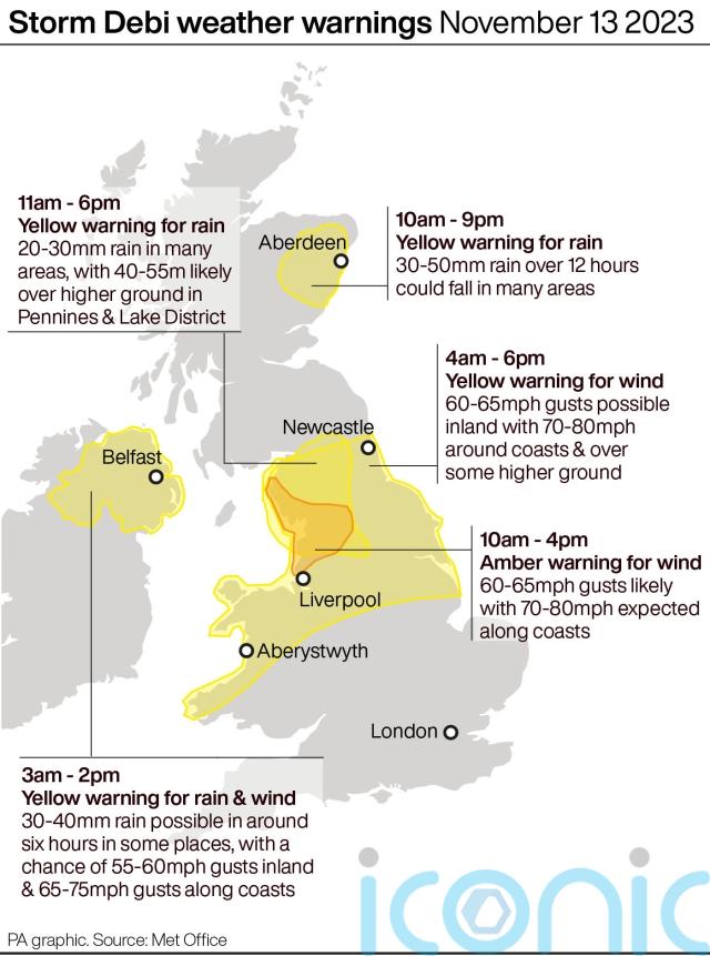 Winds of 70-80mph were expected at the coast, with 60-65mph predicted for inland areas as Storm Debi moves from west to east, heading out into the North Sea this evening.