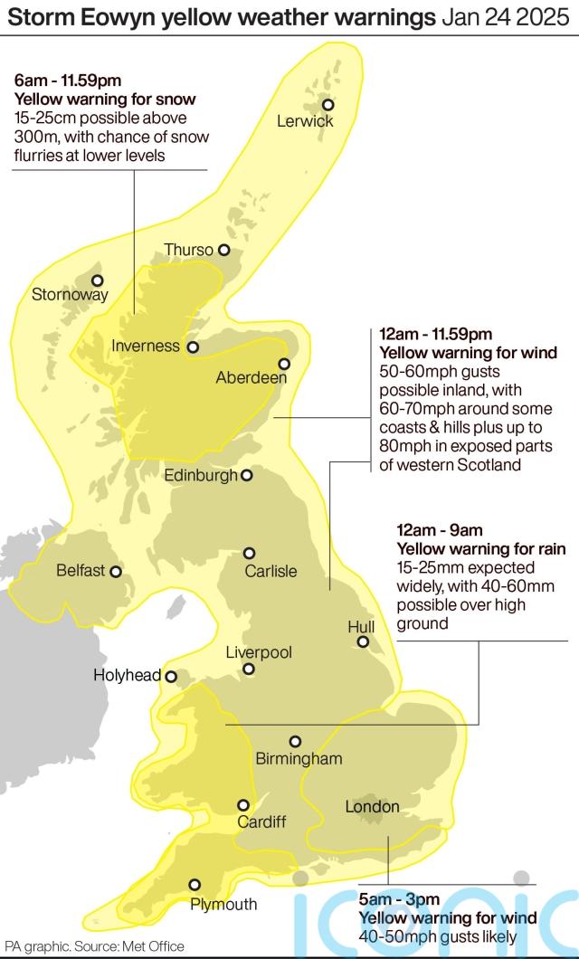 There are also yellow weather warnings in place for snow in Scotland from 6am to 11.59pm on Friday, and a yellow warning for wind from midnight to 3pm on Saturday.