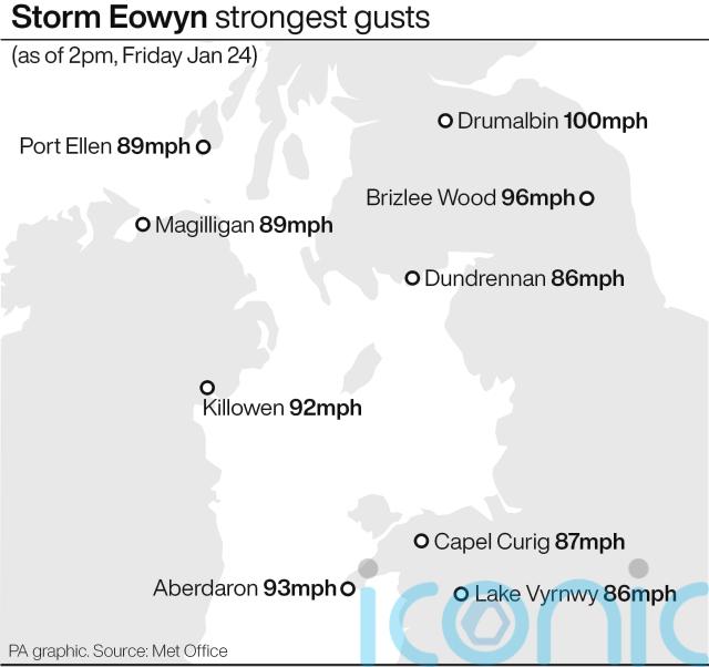 A gust of 100mph was recorded at Drumalbin in South Lanarkshire in Scotland, the strongest gust so far today in the UK, the Met Office said.
