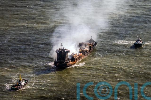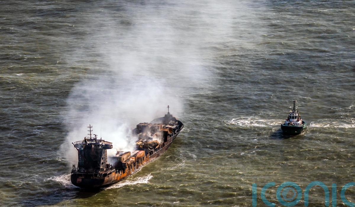 The Ernst Russ spokesman said on Wednesday afternoon that “fire activity onboard the vessel has diminished” since Tuesday, but it “continues to emit smoke with occasional reports of flames”.