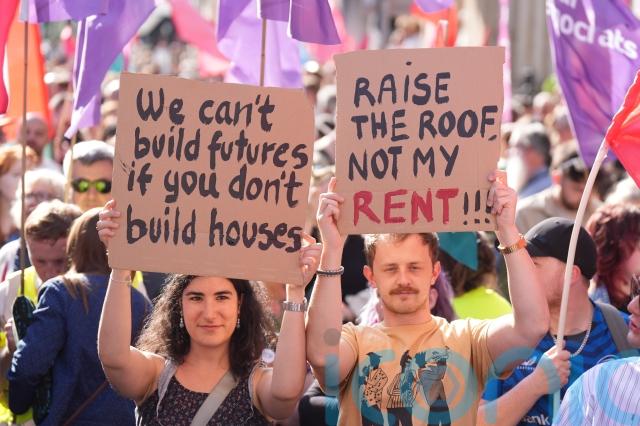 Many party political flags were visible at the protest, and there were some handmade signs with slogans such as “rent is too damn high” and “dereliction is a social crime”.