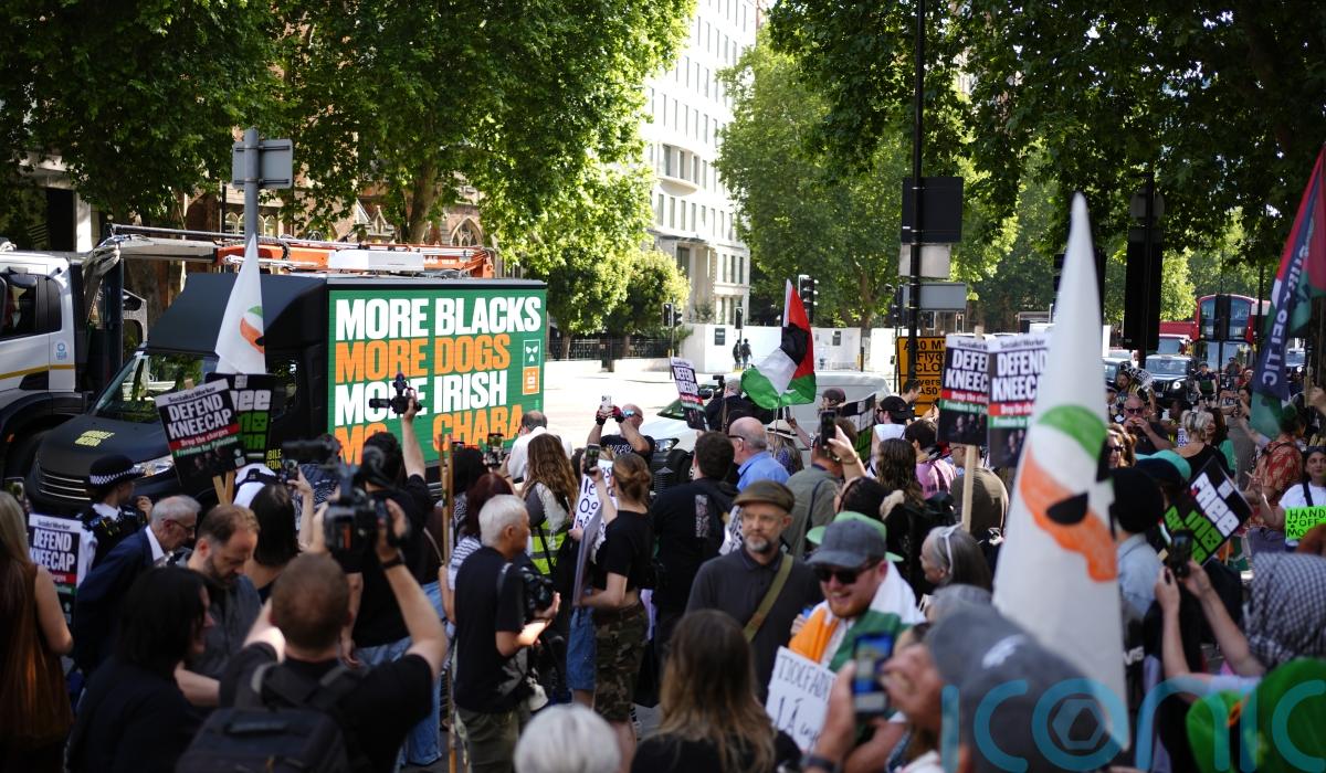A mixture of Palestinian and Kneecap flags were being held by some of the crowd, and cheers were heard after an ad van drove past displaying the slogan “More Blacks, More Dogs, More Irish, Mo Chara”.