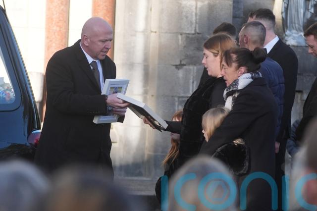 Later inside the church, Tadgh’s small white coffin was topped with flowers and accompanied by two pictures of the child, including one of him on a dirt bike.