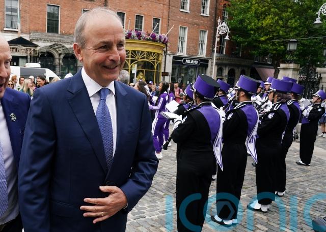 Taoiseach Micheal Martin and Dublin Mayor Caroline Conroy greeted a US marching band and cheerleaders ahead of an American football game in Dublin this weekend.