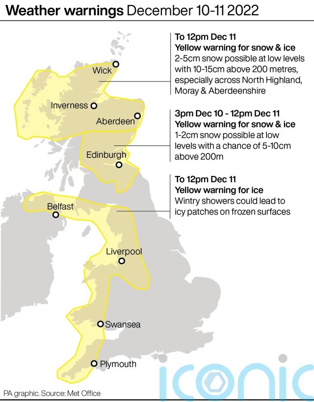 The Met Office said some disruption is likely due to icy surfaces, with snowfall in a few places. Temperatures could fall as low as minus 5C overnight, it said.
