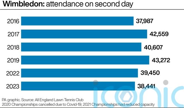 There were 38,441 in attendance for Tuesday’s rain-affected matches, compared with 42,815 on day one of the championships.