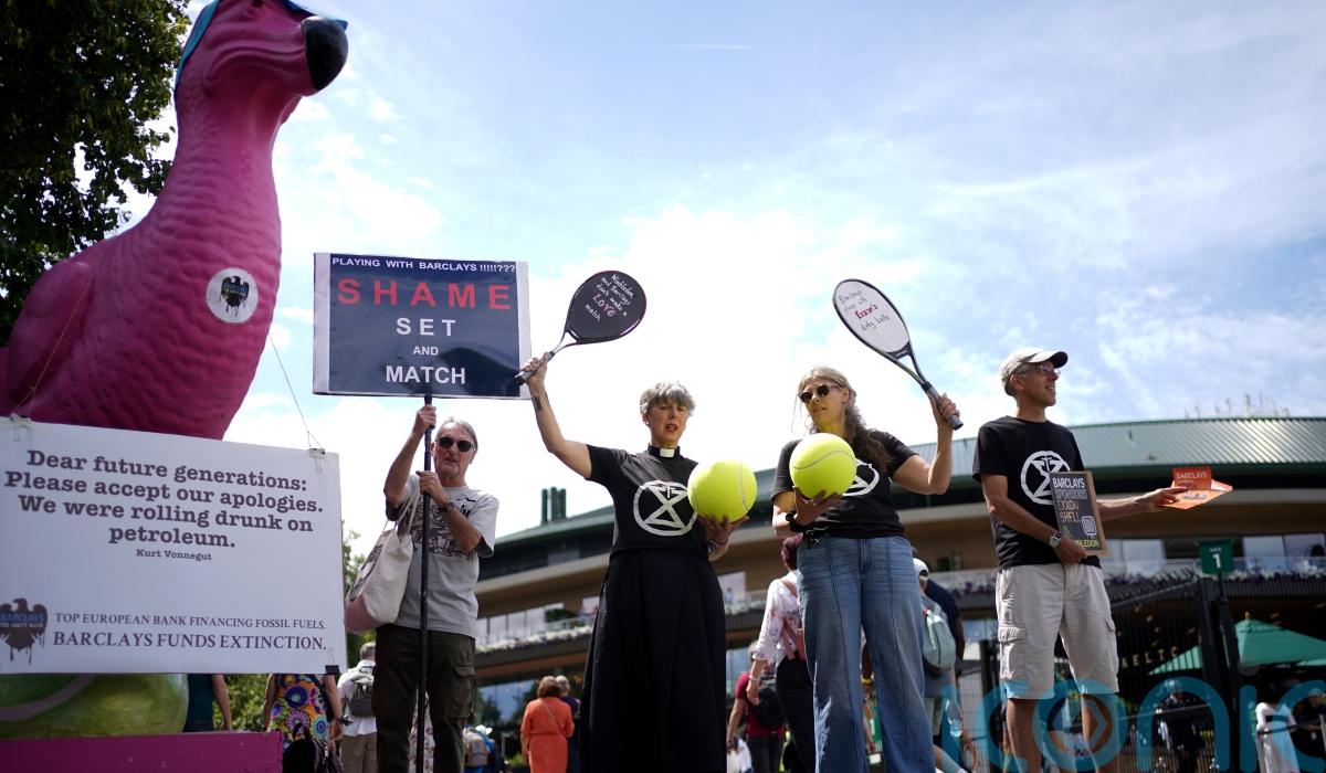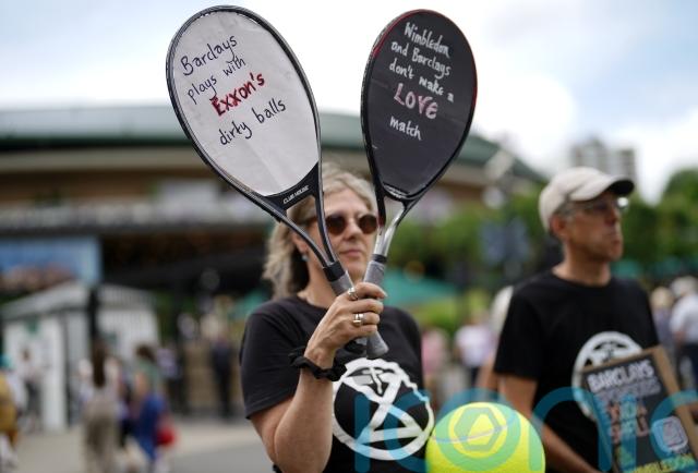 Climate change activists have gathered outside Wimbledon’s first gate to protest against the tournament using Barclays as a sponsor.