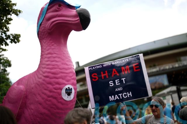 A small group stood by a large pink dodo statue in sunny SW19 holding signs that read “Shame set and match” and “Wimbledon and Barclays don’t make a love match”.