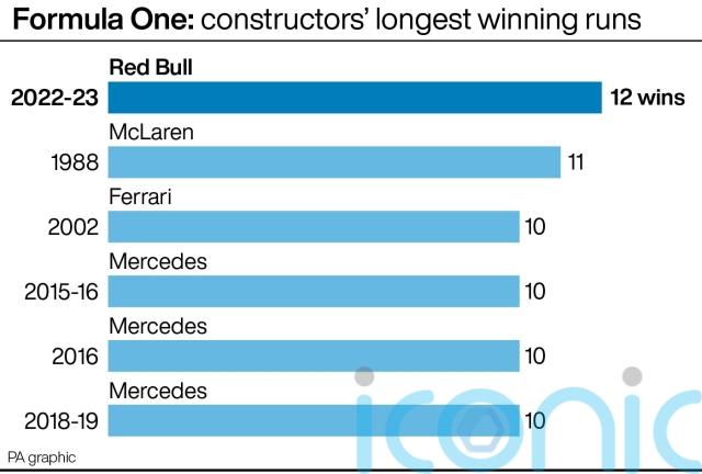 Mercedes had three separate runs of 10 successive wins during Lewis Hamilton’s period of dominance, with Michael Schumacher’s Ferrari team also hitting double figures in 2002.
