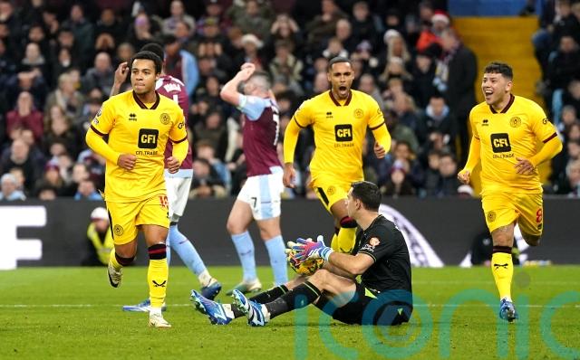 Blades boss Chris Wilder packed a five-man defence to contain the hosts and United lived dangerously early when Ollie Watkins was shoved by Vini Souza as he lurked for Lucas Digne’s cross.