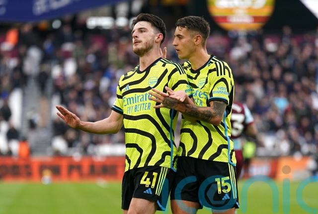 Saka scored twice, including a penalty having missed a crucial spot-kick in the same game last season, while William Saliba, Leandro Trossard, Gabriel Magalhaes and former West Ham captain Declan Rice completed the rout.