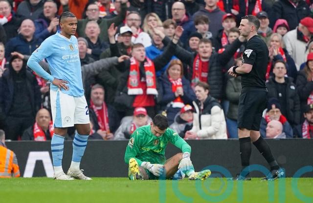 Manchester City goalkeeper Ederson looks likely to miss the champions’ crucial title clash with Arsenal later this month after suffering a thigh injury at Liverpool.