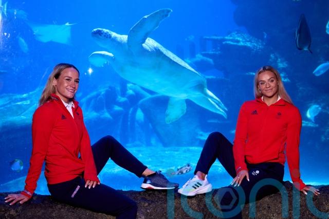 On Monday they added another unique experience, jumping into a tank at London’s Sea Life aquarium, where they swam with giant turtles, fish and other wildlife whose graceful twists and twirls bring to mind what one might expect from the duo this summer.