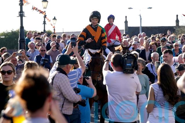 Joining the trainer for the parade were the winning jockey and Bradford-born owner Stewart Andrew, whose late wife Sadie went to school with Mullins before their paths crossed many years later, leading to the purchase of Nick Rockett – the pride and joy of delighted groom Katie Walton.