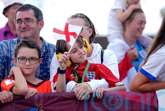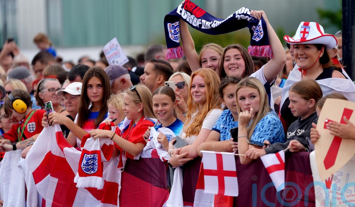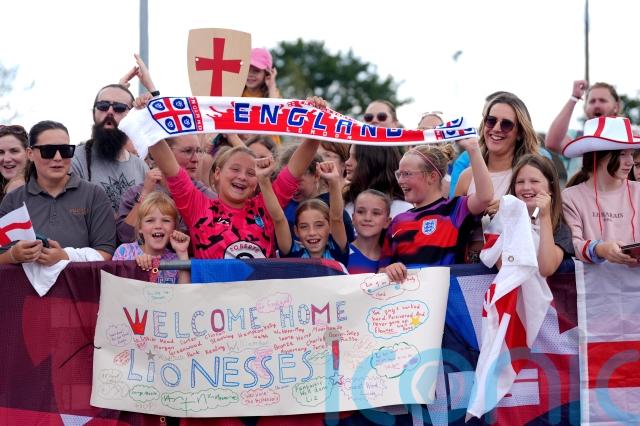Supporters, many of whom were dressed in England kits and holding flags, erupted in cheers at Southend Airport in Essex as they saw the white and red plane approaching the runway and again as the team emerged from the airport to walk along a red carpet before waving at fans.