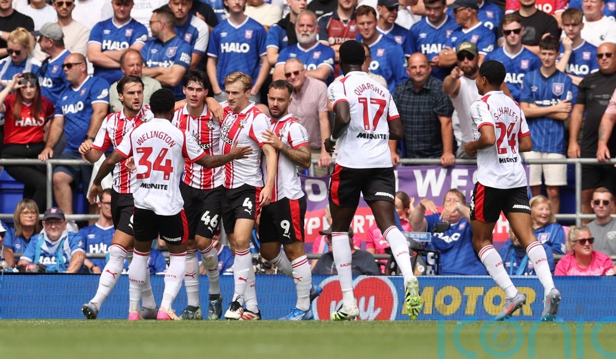 Ipswich took the lead when George Hirst intercepted a wayward pass and crossed from the right for Jack Clarke to head towards goal, with the ball deflecting off Saints centre-back Harwood-Bellis’ chest and into the net.