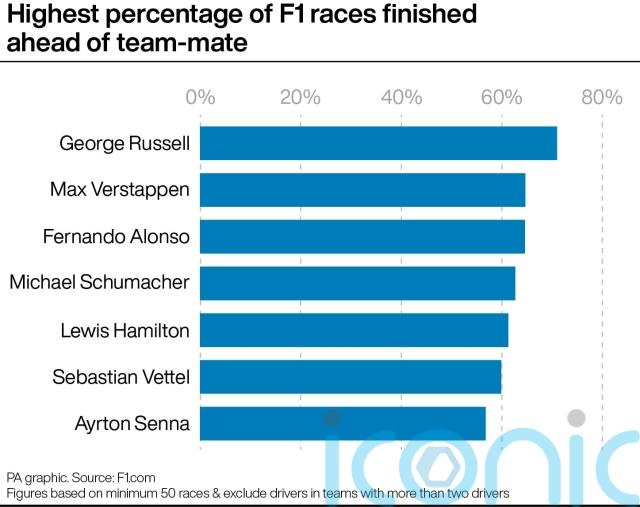 George Russell has a better record of beating his team-mate than any other driver to have started at least 50 races in the last 40 years, PA news agency analysis reveals.