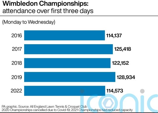 This year’s cumulative total of 114,573 is currently the lowest since 2016, which saw 114,137 attendances over the first three days, according to analysis by the PA news agency of official figures published by All England Lawn Tennis & Croquet Club.